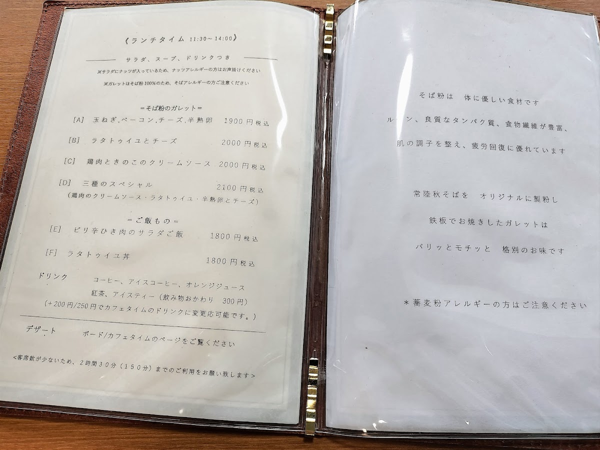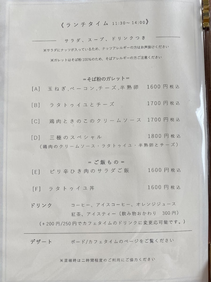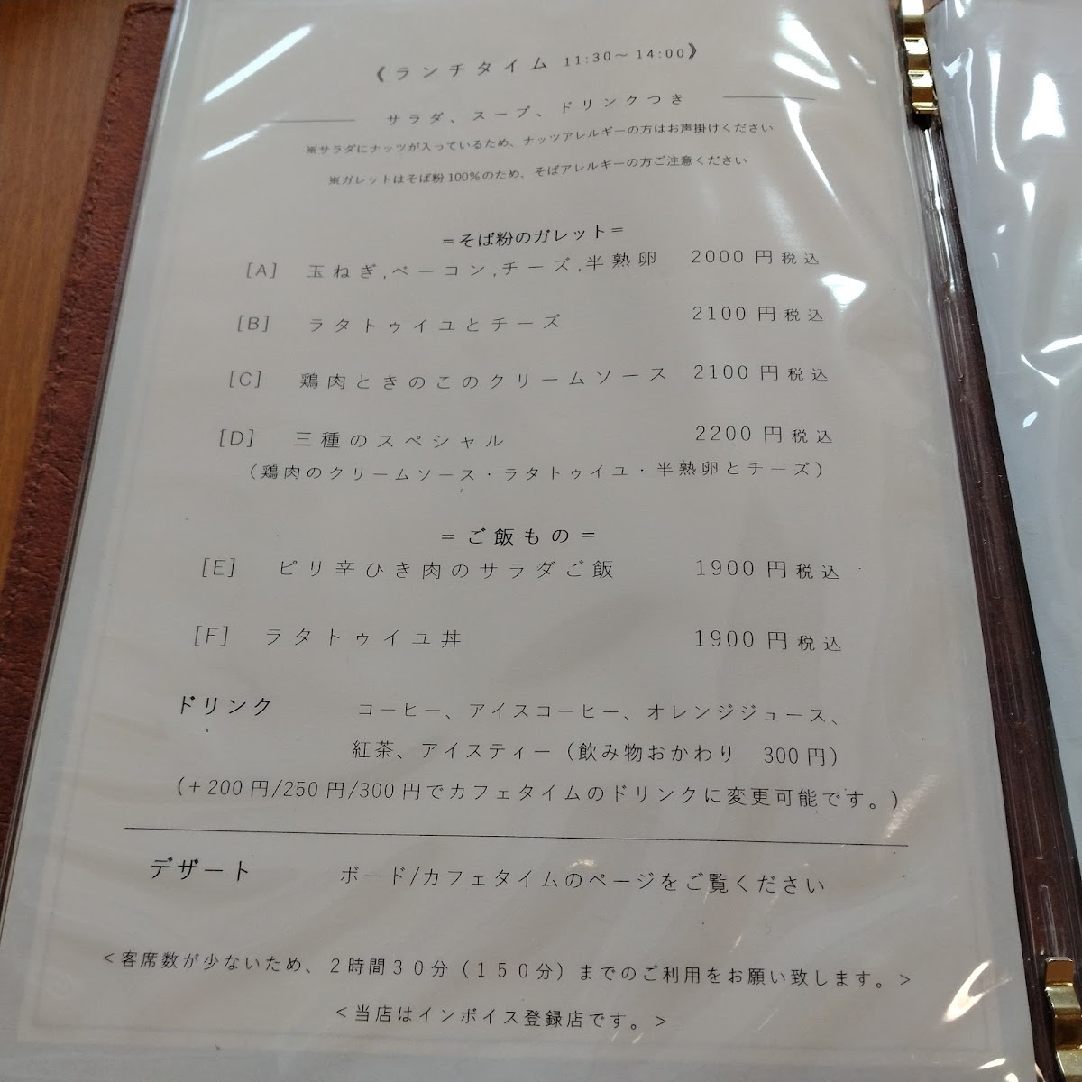 The menu is a delightful fusion of flavors, with a particular emphasis on the local specialty—soba flour. The standout dish here is the savory galette, available in three delicious variations that include chicken with creamy mushroom sauce, ratatouille, and a rich blend of soft-boiled eggs and cheese. Each galette is prepared with a thin, moist texture that pairs beautifully with its fillings, making it a comforting meal that warms the heart. A lunch set also includes a vibrant salad adorned with fresh veggies and a delectable carrot potage soup, all for a reasonable price of around 1650 yen.